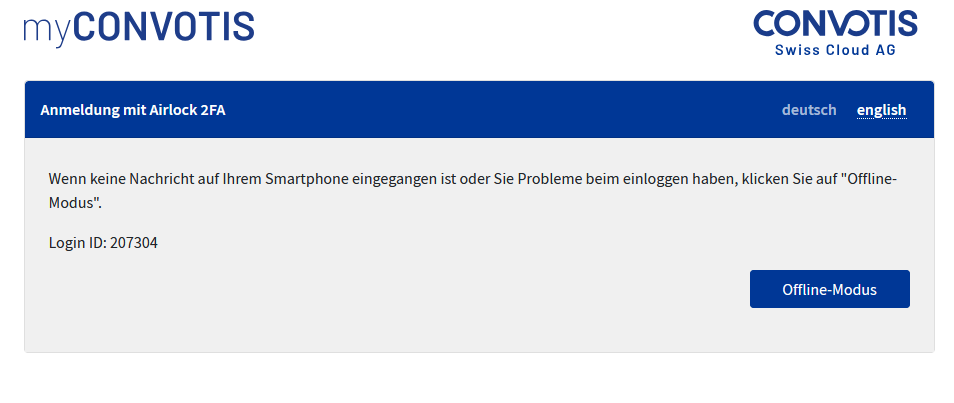 Wenn Ihr Mobiltelefon mit der Airlock 2FA-App online ist, erhalten Sie eine Push-Benachrichtigung, die Sie akzeptieren müssen, um fortzufahren. Sollte Ihr Mobiltelefon nicht online sein, klicken Sie bitte auf „Offline-Modus“.
