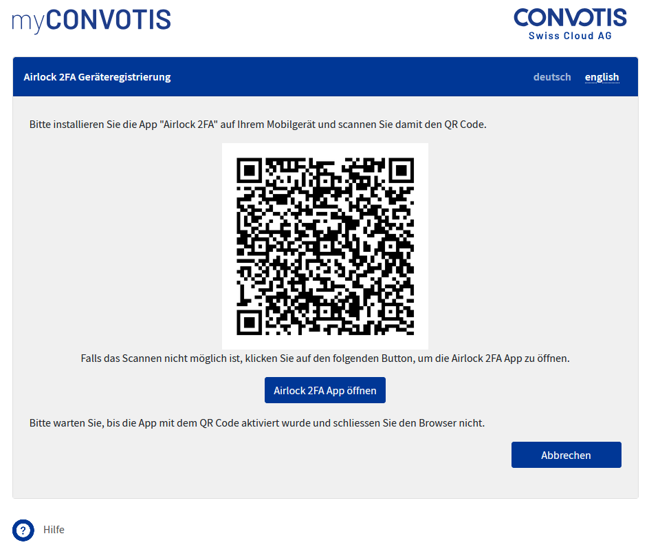 If you are on your computer open the Airlock 2FA-App on your mobile phone, select “QR Scanner” and scan the QR Code. If you are on the same mobile device on with you installed the Airlock 2FA-App click on “Open Airlock 2FA App”.