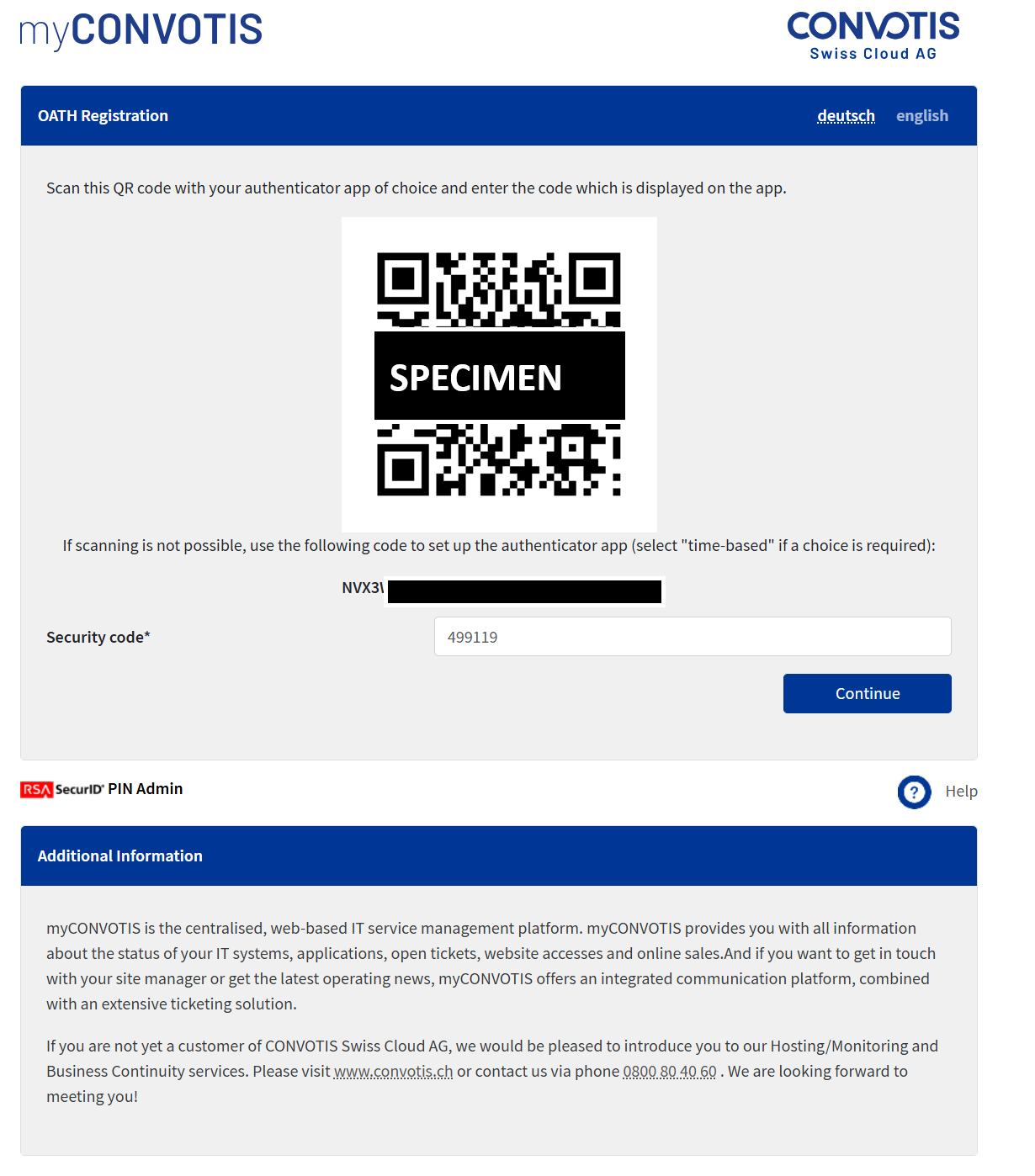 Scan the QR code with your authenticator app and enter the displayed six-digit code in the browser. Click “Continue”.”